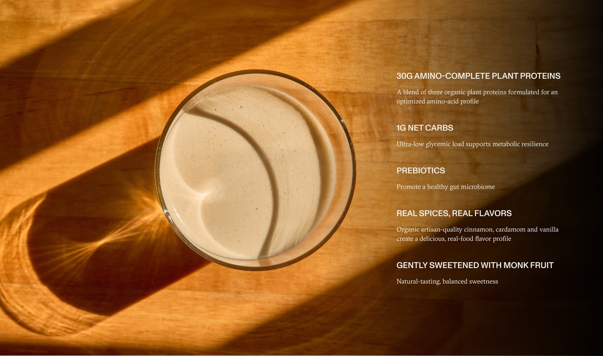 Organic plant proteins, prebiotics, and single-origin spices, tastefully sweetened by monk fruit.