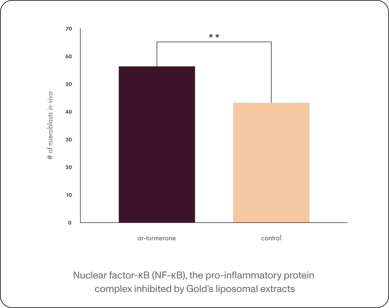 Ar-Turmerone and Curcumin (the other primary bioactive in Gold) have been shown to have potent neuroprotective effects, reduce levels of LDL and other lipids connected to heart disease and stimulate production of the immune cells responsible for protection against viral and bacterial pathogens.