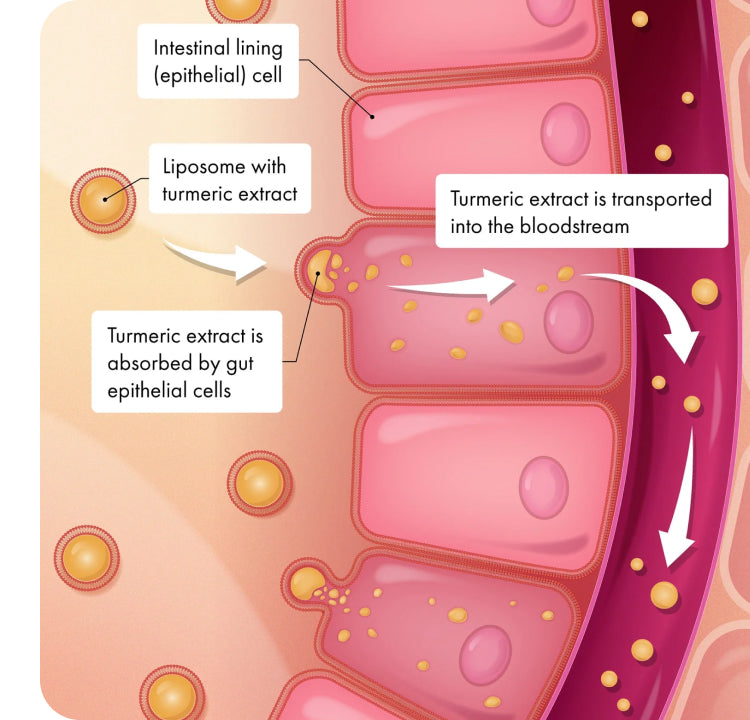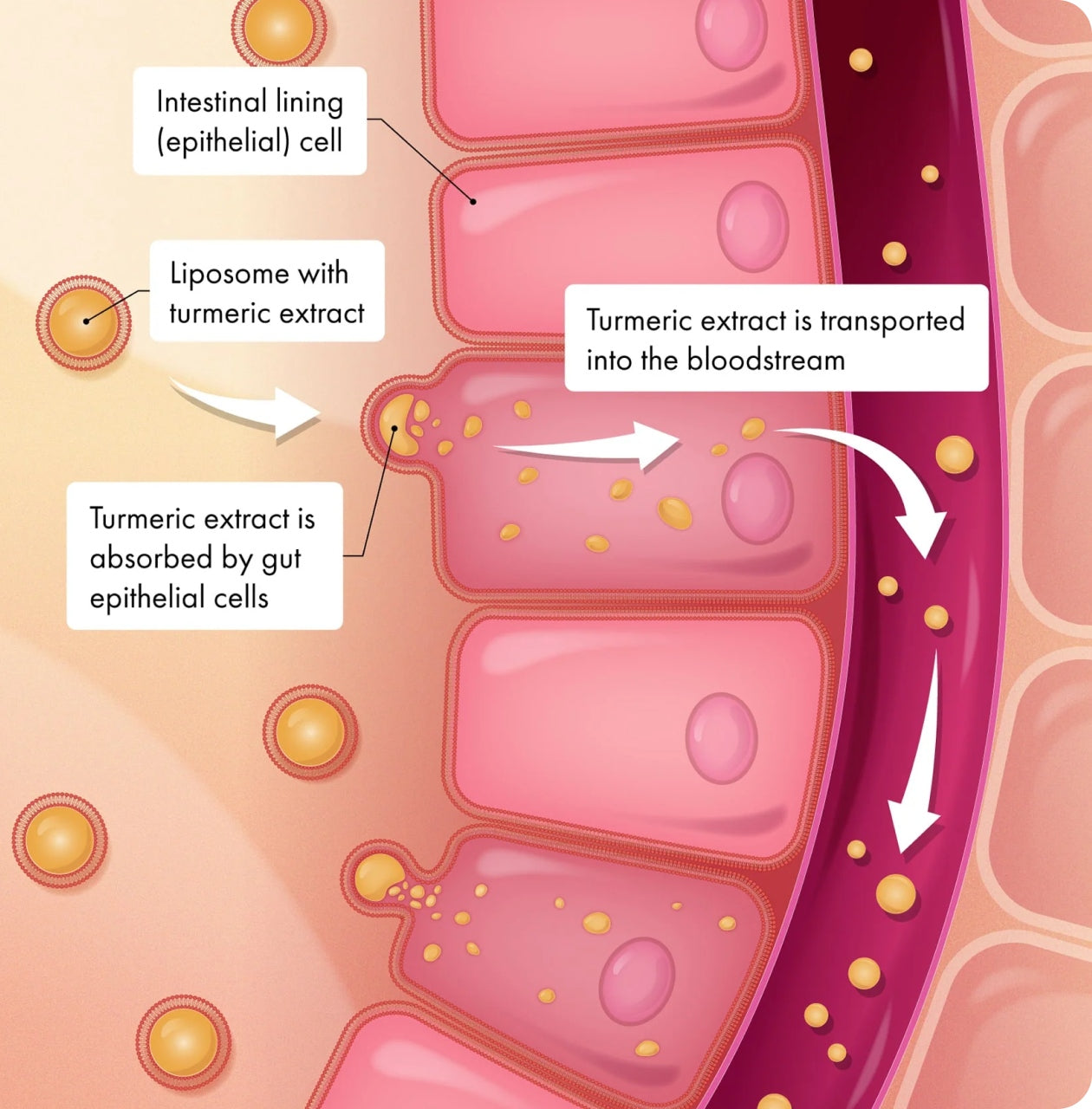 In non-liposomal formulas (99.9% of turmeric supplements), turmeric bioactives are rapidly degraded by enzymes in our gut and poorly absorbed by gut epithelial cells.