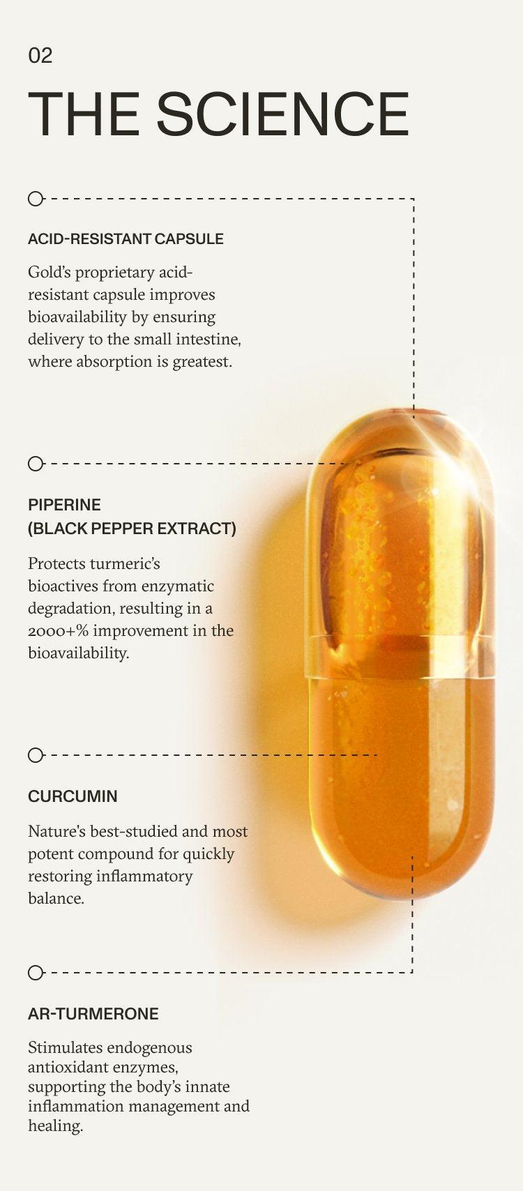 Gold uses a proprietary liposomal nano-encapsulation that protects turmeric’s bioactives from degradation and delivers them directly into gut epithelial cells.